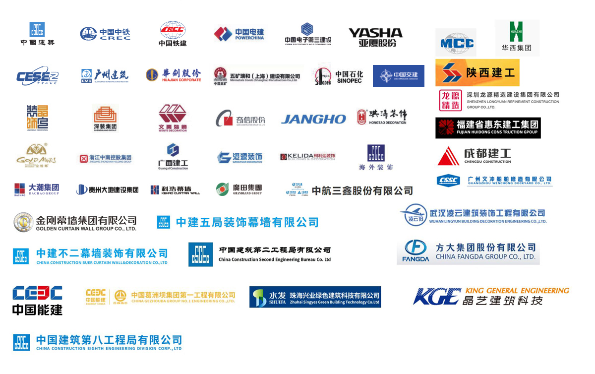 公司參建了諸多大型項目工程,如港珠澳大橋、珠海國際航展、深圳國際會展中心、廣州白云機場、西安全運會場館、成都東安湖大運會場館、樂山奧體中心、洛陽奧體中心、增城富士康廠房、惠州中海油、陽江核電站、珠三角各地鐵線、高鐵站、廣西桂林機場、廣西柳州文化廣場、四川成都天府機場、海南??诿捞m機場、西安絲路會展中心、惠州北站等等。與中國建筑、中國中鐵、中國鐵建、中國電建、中國交建、中國中冶、中國能建、廣東建筑、廣西建工、廣州建筑等大型國有企業(yè)下屬公司及江河幕墻、金螳螂裝飾等各大建筑裝飾、幕墻裝飾公司達成長期友好合作關(guān)系。